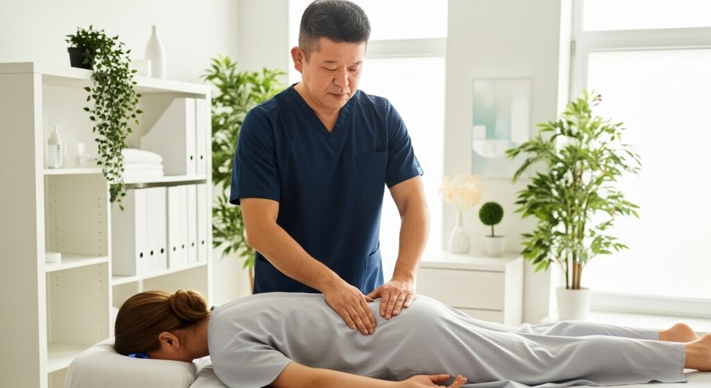 丸くなった背中を整え、呼吸しやすく、負担の少ない姿勢に導く施術です。